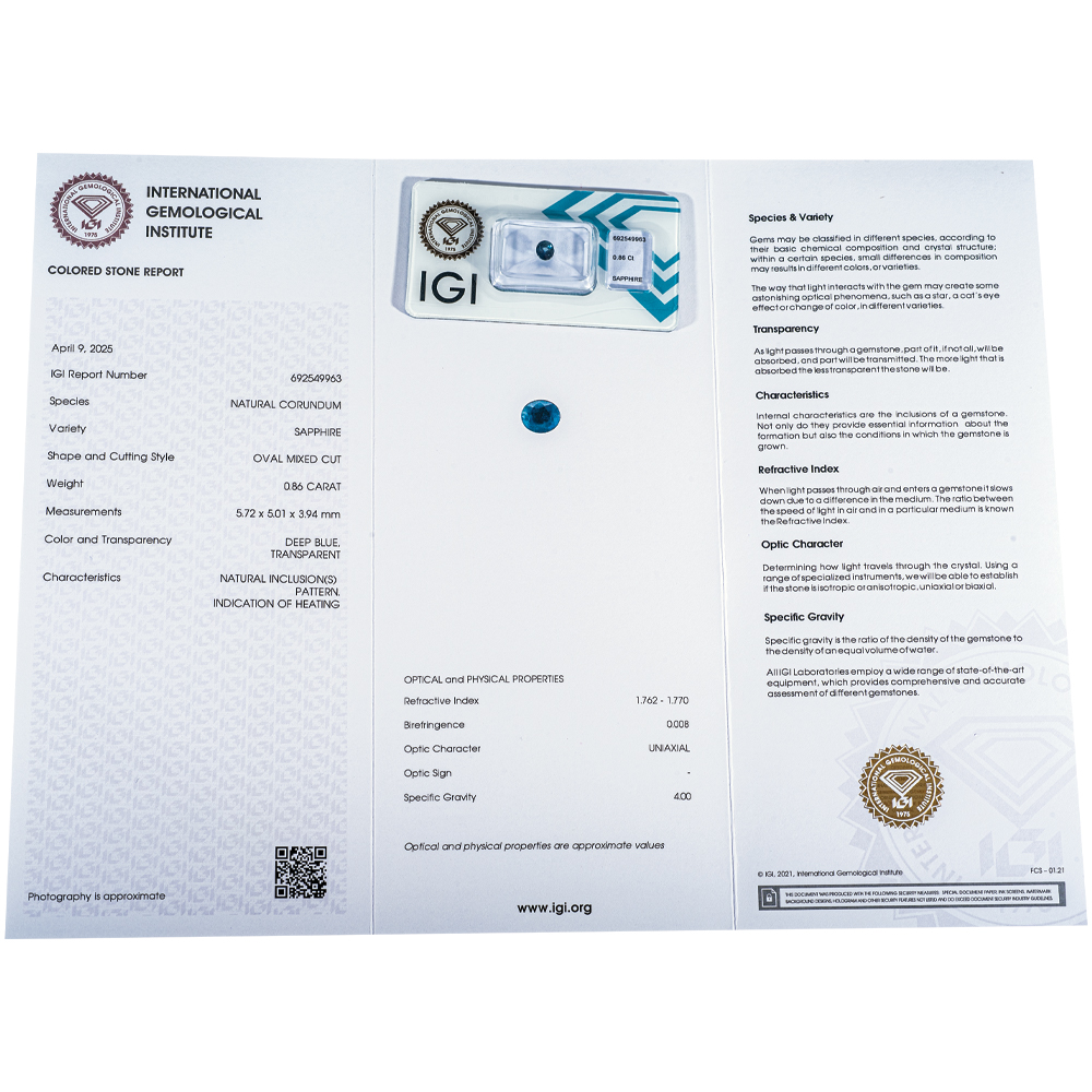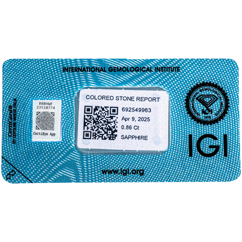 IGI Certificate Blue Sapphire 0.86 ct.