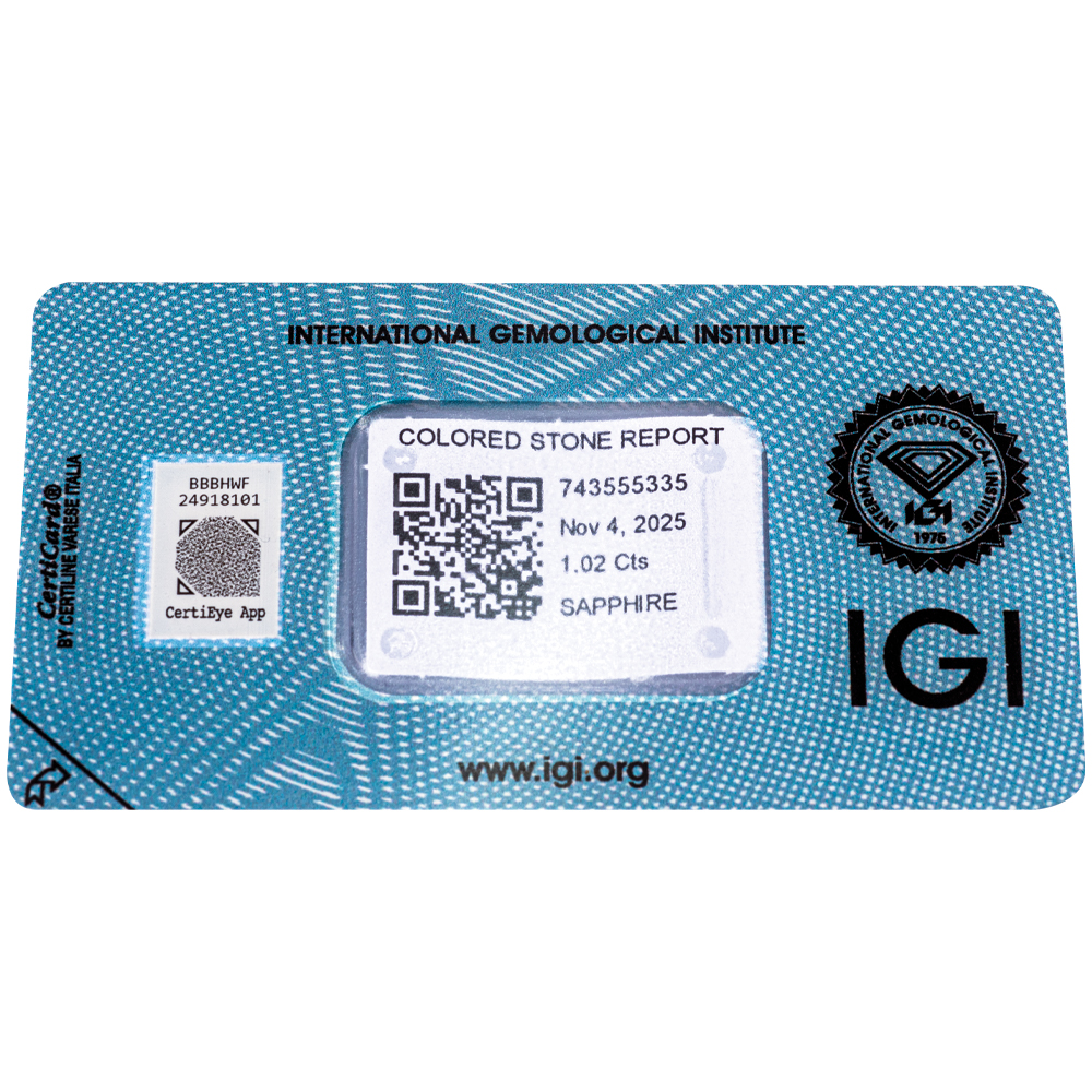 IGI Certificate No Treatment Blue Sapphire 1.02 ct.